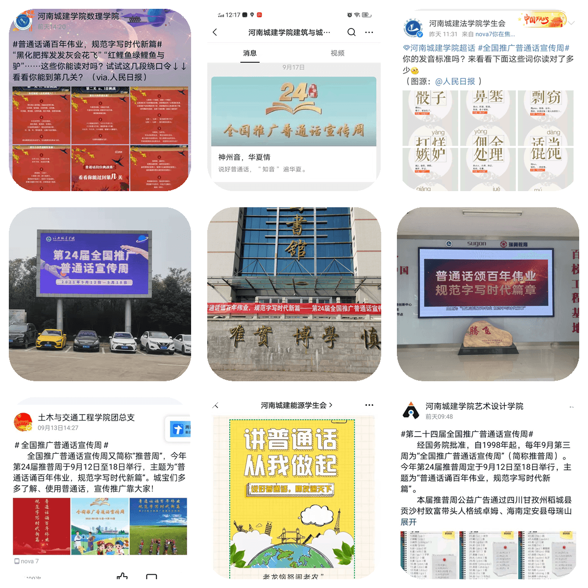 活动周中,各学院及相关单位充分结合实际,精心策划,周密组织,广泛发动宣传,充分利用宣传横幅、电子屏、“学习强国号”、微信公众号、班级工作群、QQ官方号、微博、抖音等平台宣传普及国家语言文字方针政策和法律法规、普通话相关常识及趣味文字挑战知识,创设了良好的语言文字环境,形成了推广普通话、促进语言文字规范化的良好氛围。