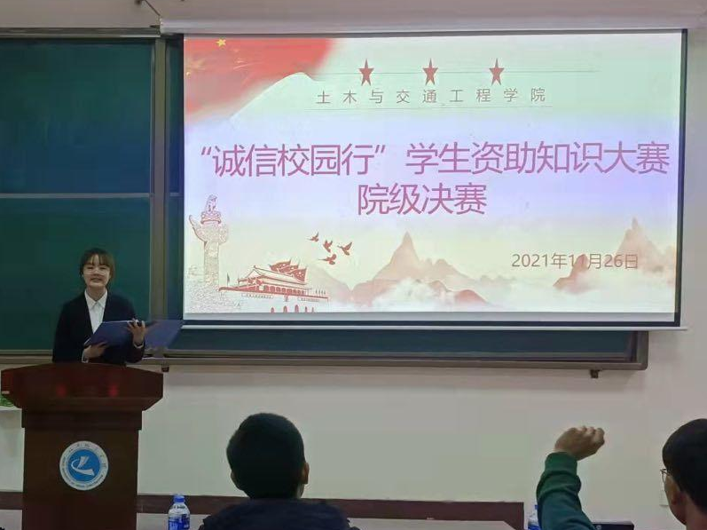 (通讯员:徐梦杰 胡垚)为全面贯彻落实习近平新时代中国特色社会主义思想,深入学习党的十九大及十九届六中全会精神及全国、全省教育大会精神,坚持和加强党对学生资助工作的领导,大力宣传国家资助政策,土木与交通工程学院于11月26日在10号教学楼B107举办了“诚信校园行”学生资助知识竞赛院级决赛。