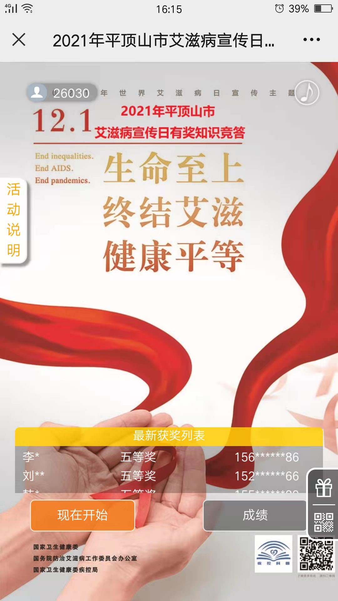 在第34个世界艾滋病日来临之际,平顶山市疾病预防控制中心主办2021年平顶山市艾滋病宣传日有奖知识竞答于11月25日正式启动。校医院积极组织我校学生参与线上答题。