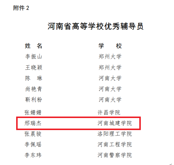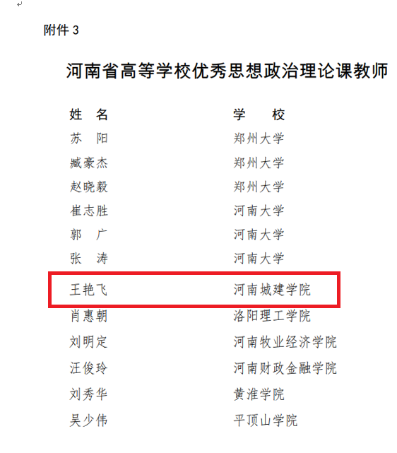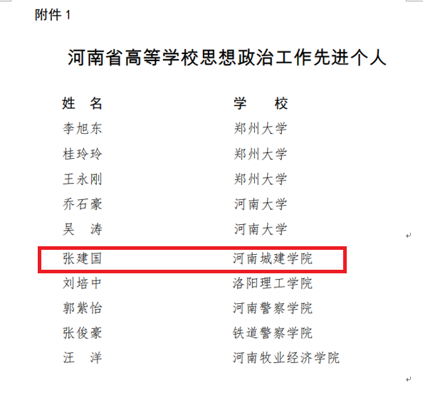 近日,省委教育工委、省教育厅公布了2022年度河南省高等学校思想政治工作奖评审结果,我校4名教师获奖。其中,党委宣传部部长、文明建设办公室主任张建国荣获“2022年度河南省高等学校思想政治工作先进个人”荣誉称号,管理学院辅导员邢瑞杰荣获“2022年度河南省高等学校优秀辅导员”荣誉称号,马克思主义学院教师王艳飞荣获“2022年度河南省高等学校优秀思想政治理论课教师”荣誉称号,大学生心理健康教育指导中心教师贾汛荣获“2022年度河南省高等学校优秀心理健康教育工作者”荣誉称号。