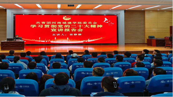 为推动开展学习贯彻习近平新时代中国特色社会主义思想主题教育活动,在广大团员青年中掀起持续学习党的二十大精神的热潮,4月24日下午,我校邀请党的二十大代表、舞钢市银龙集团苗静静来我校作关于党的二十大精神宣讲报告。宣讲报告会在行政楼学术报告厅举行,校团委全体人员、各二级学院团总支书记代表、青马班学员代表、青年志愿者学生代表和青年团员代表参加了报告会。