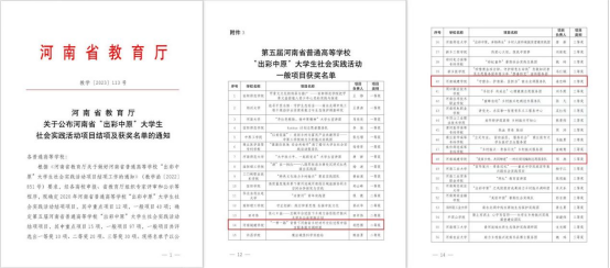 近日,河南省教育厅印发《河南省教育厅关于公布河南省“出彩中原”大学生社会实践活动项目结项及获奖名单的通知》,经各高校申报、省教育厅组织专家评审和公示等程序,我校《“一带一路”背景下河南省乡村对外交往过程中语言服务提升调研团》项目荣获二等奖,《“守碧水,护清渠,显担当”南水北调服务队》项目和《“美丽乡村,共同缔造”——村庄规划编制志愿服务队》项目荣获三等奖。