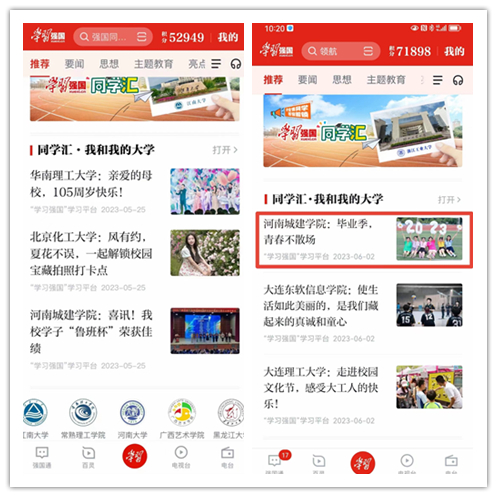 2021年以来,在学校党委的大力支持和领导下,我校充分利用国家级新媒体宣传品牌优势,在学习强国平台先后上线了河南城建学院“学习强国号”和“同学汇”,全面宣传学校思政教育、教学科研、社会服务、校园文化、大学生活等方面的建设发展成就,全方位提高学校的知名度和美誉度。