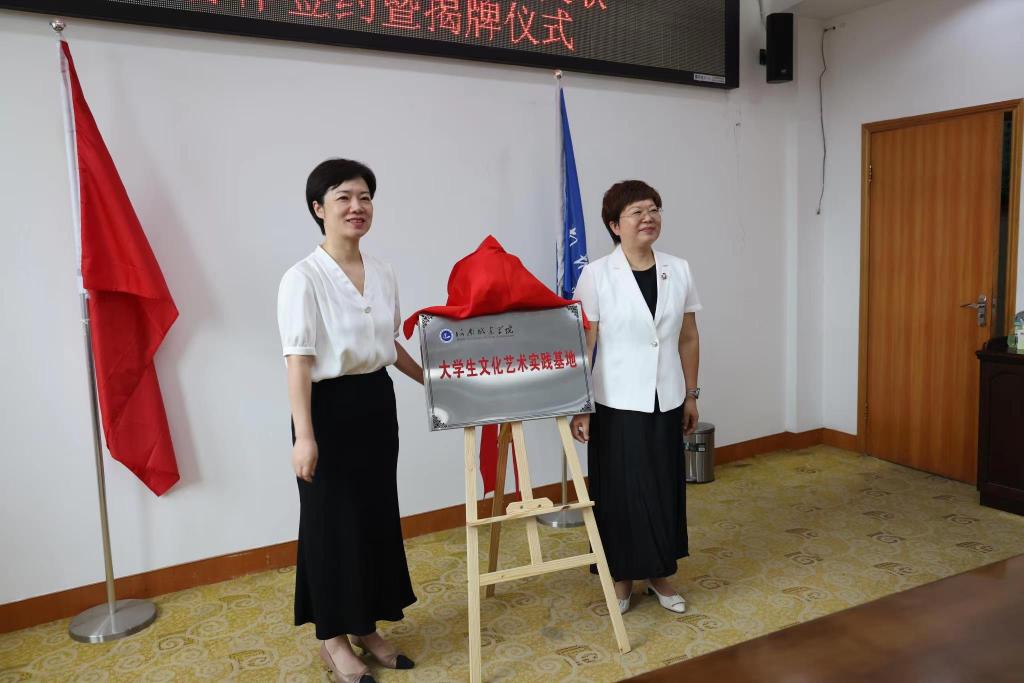 仪式上,王靖与虎静等共同为“河南城建学院大学生文化艺术实践基地”“平顶山市文联曲艺培训基地”和“平顶山市文联书法培训基地”揭牌。