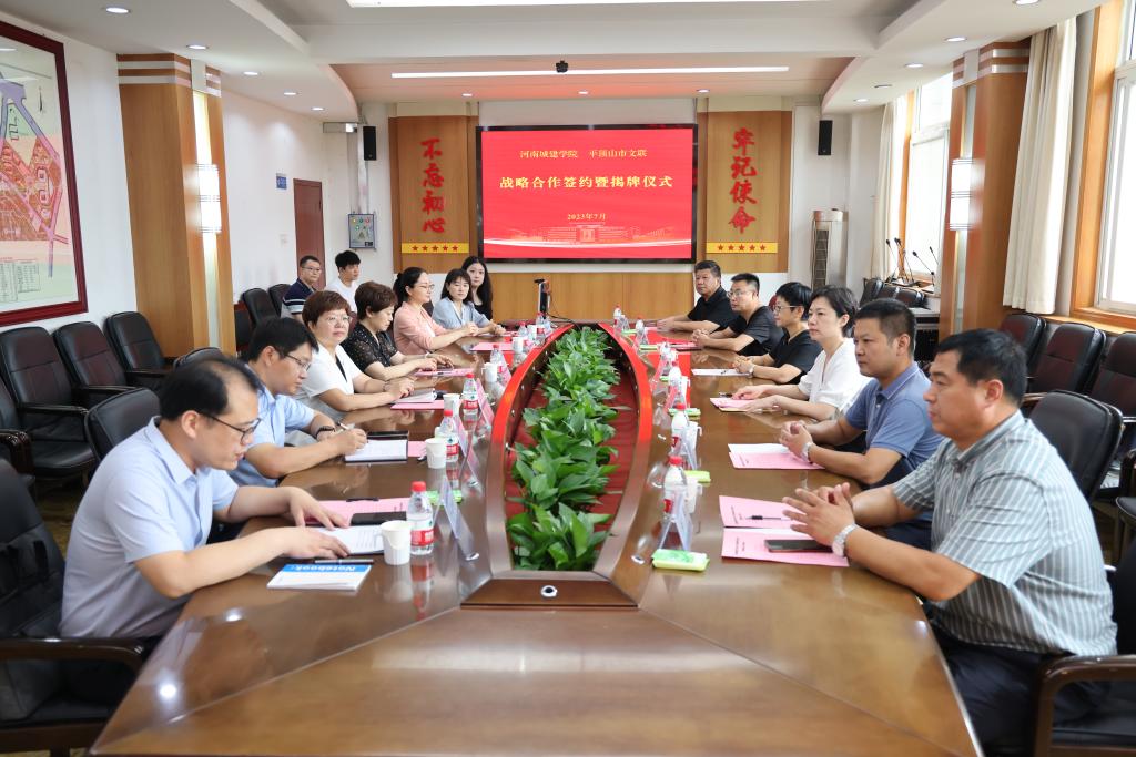 7月13日上午,我校与平顶山市文联举行战略合作签约暨揭牌仪式。平顶山市文联党组书记、主席虎静,副主席王玲,市文联四级调研员赵小永,平顶山市曲艺家协会主席张高伟,平顶山市曲艺家协会副主席、秘书长杨振伟,平顶山市书法家协会副主席郑庆伟,我校党委副书记王靖,党委学工部、团委、公共艺术教育中心等相关单位负责人出席活动。