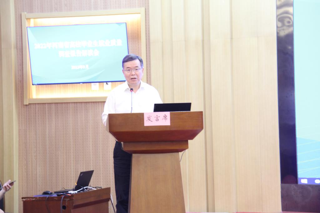 河南省教育评估中心副主任张新民以《“数”说我省高校毕业生就业,反思招生培养就业改革联动》为题,从编制流程、指标体系、核心数据等方面对《2022年河南省高校毕业生就业质量调查报告》作详细解读。沈阳师范大学副校长刘铸围绕就业质量调查报告现状、背景意义、主要问题及优化对策等方面作了深入阐述。