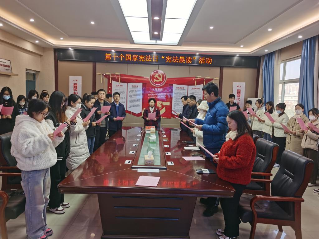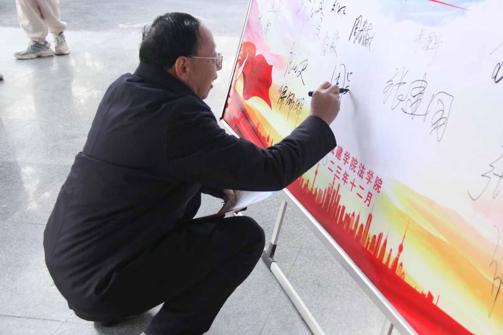 在校内,早上7点多,志愿者们在和谐校区与龙翔校区同步开展宣传活动,他们悬挂宣传条幅、摆放宣传展板、向师生发放宪法伴我成长宣传册、感受宪法精神主题签名,并开展法律咨询服务活动。上午九点三十五分,学校在法学院设立学校参与主会场,其他各教学院部设立学校参与分会场,校党委副书记王靖、校党委委员、宣传部长张建国以及法学院师生一起参加“宪法晨读”活动。伴随着庄严的国歌后,宪法晨读活动正式开始,与会师生共同跟随主会场跟读宪法部分条款,声音整齐响亮、铿锵有力,在重温宪法条款的同时,感受宪法的神圣和庄严。
