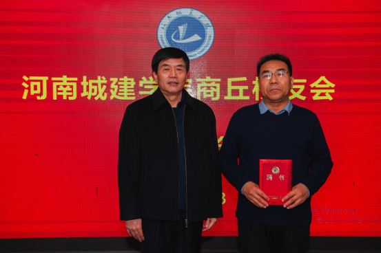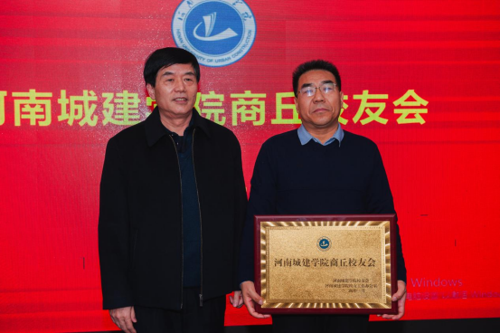 宿金勇为商丘校友会授牌,并为第一届理事会会长颁发聘书,宋新生为第一届理事会副会长、秘书长颁发聘书,秦小锋、杨毅分别为第一届理事会理事颁发聘书。孙杰为副秘书长颁发聘书。