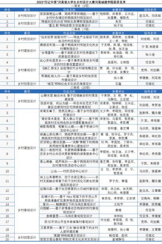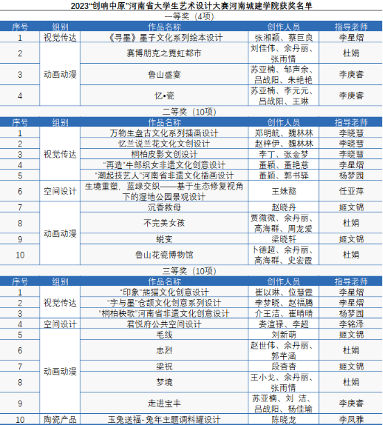 其中,在“创响中原”大学生艺术设计大赛中,荣获一等奖4项、二等奖10项、三等奖10项,我校获优秀组织奖;在“智造中原”大学生工业设计大赛中,荣获一等奖1项、三等奖6项、优秀奖4项;在“建美中原”大学生建筑设计大赛中,荣获一等奖3项、二等奖3项、三等奖3项,我校获优秀组织奖;在“印记中原”大学生乡村设计大赛中,荣获一等奖3项、二等奖7项、三等奖20项,我校获优秀组织奖。