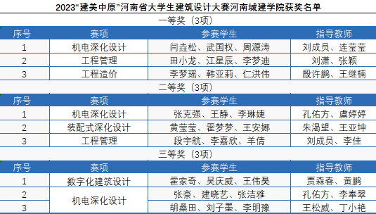 近日,河南省教育厅下发了《河南省教育厅关于公布2023“设计河南”系列大学生学科竞赛获奖名单的通知》(教高〔2024〕19号),我校喜获佳绩,共获省级奖项74项,其中荣获一等奖11项、二等奖20项、三等奖39项、优秀奖4项,3个优秀组织奖,获奖总数位居全省所有参赛高校第3名。