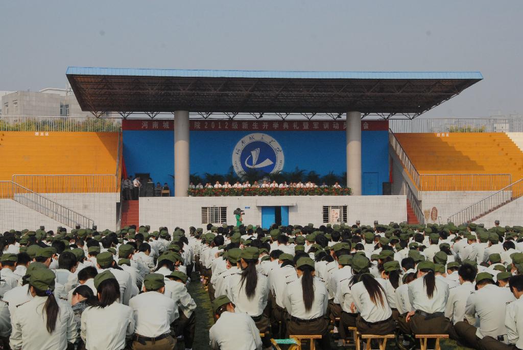 9月18日上午,我校在塑胶操场隆重举行2012级新生开学典礼暨军训动员大会。学校党委书记李德平出席典礼并向军训团授旗,院长孔留安出席典礼并讲话,校领导史战芳、王召东、李建生、陈丙义、张坤书、王春阳、赵金安、许朝民,军训团团长中国人民解放军71382部队教导员孔令磊等出席典礼,典礼由党委副书记王召东主持。各系部、相关部门负责人同5300多名新同学参加典礼。