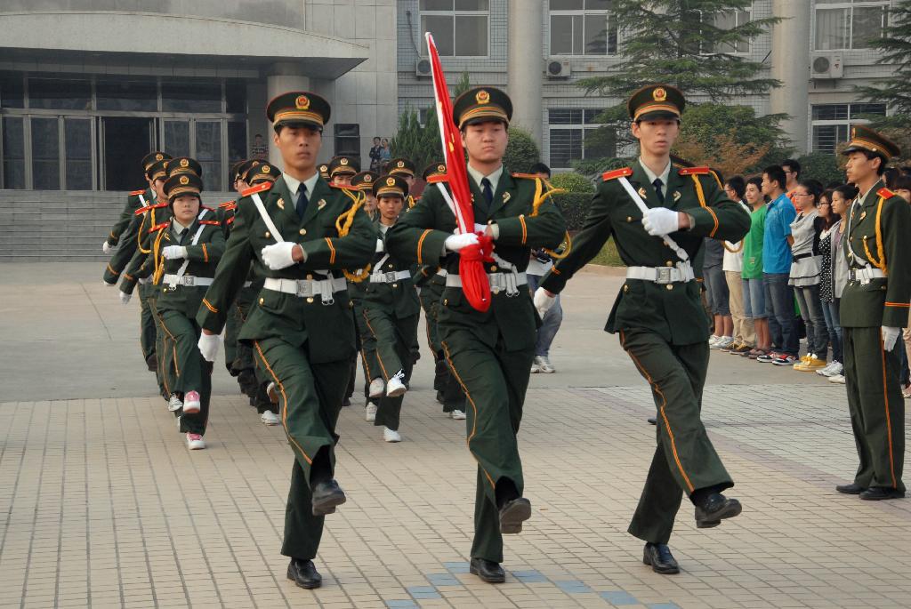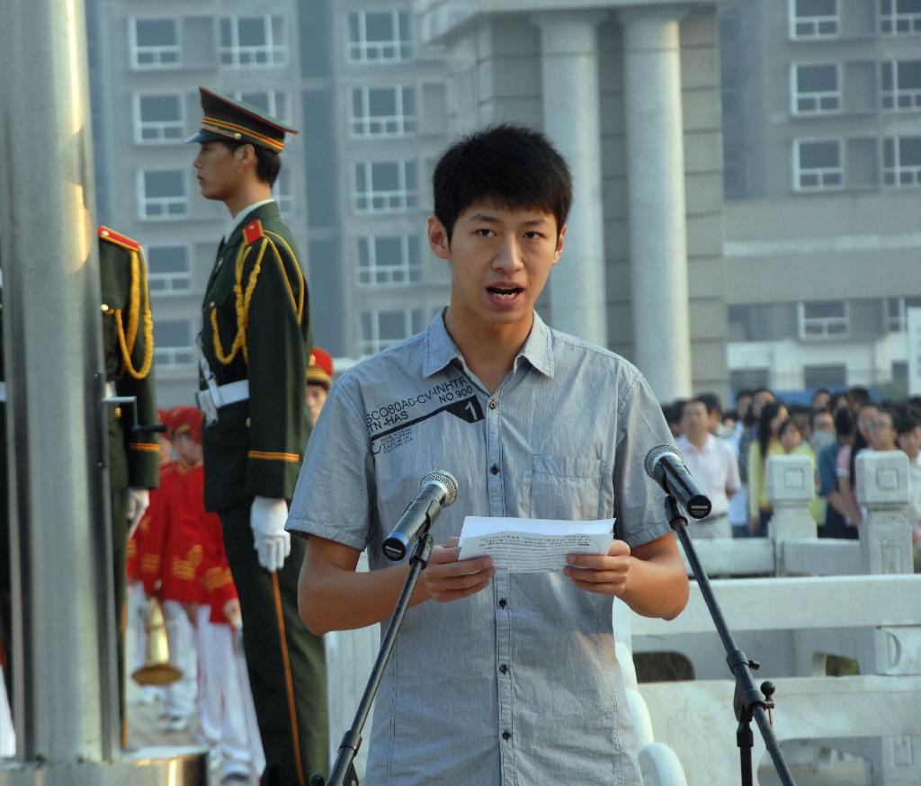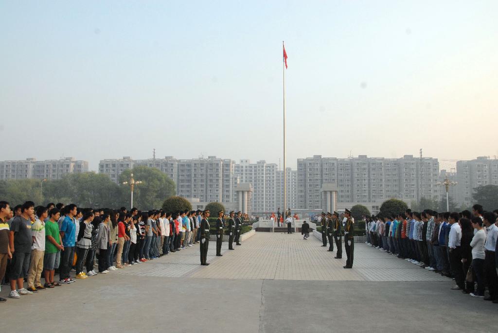 早上7时整,在庄严肃穆的气氛中,国旗队的同学们身着礼装,排着整齐的方队,迈着有力的步伐把国旗护送到旗台。之后,伴随着雄壮有力的义勇军进行曲,鲜艳的五星红旗在数千双眼睛的注视下冉冉升起,飘扬在校园上空。