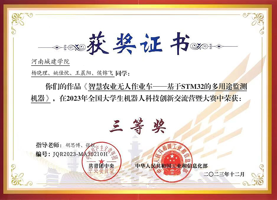日前,由共青团中央、中华人民共和国工业和信息化部主办的2023年全国大学生机器人科技创新交流营暨机器人大赛获奖名单公布,我校选送的作品《智慧农业无人作业车——基于STM32的多用途监测机器》荣获三等奖。