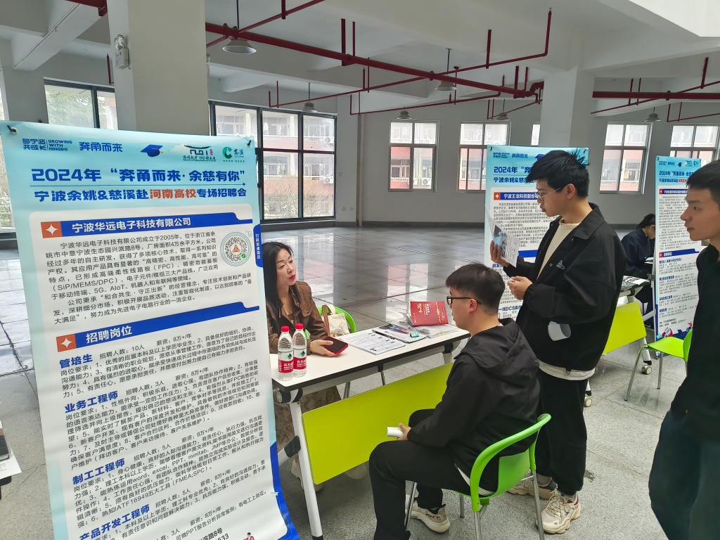 据悉,本次招聘会线上线下同步进行,线上会场依托宁波市人力资源综合服务平台小程序,可一键查看企业介绍,岗位信息,招聘条件及薪酬福利等情况,同时实现在线直接投递简历。线下主会场有宁波佳音机电科技股份有限公司、宁波永基精密科技有限公司、卓力电器集团有限公司、宁波中大力德智能传动股份有限公司等16家上市公司及地域内龙头企业争相进校揽才,吸引了我校近千名毕业生线下参会。应届毕业生积极与企业代表交流,通过面对面的沟通,了解行业需求和职业要求,现场投递简历400余份,初步达成意向80余名学生。招聘会现场还增设了河南省大学生就业创业服务指南借阅处、政策咨询处、余姚市人才招引政策宣传页,现场发放政策宣传资料300余份。