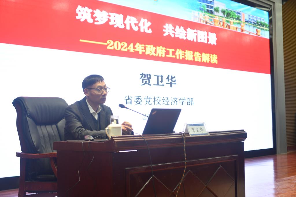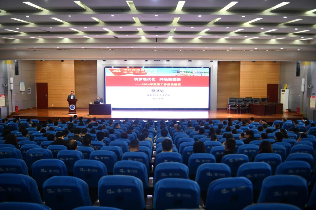 在学习“两会”精神主题培训中,邀请到了省委党校经济学教研部主任贺卫华教授作报告。贺教授以《筑梦现代化、共绘新图景》为题,以2024年政府工作报告解读为切入点,阐释了政府工作报告的总体要求和政策取向,讲清了当前经济社会发展的形势,解读了现阶段的目标任务,对于我们进一步强化“面向经济主战场、面向国家重大需求与区域经济发展战略办教育”的价值理念,从政府工作报告中、尤其是中国现代化河南实践中发现“时代之问”“河南之问”,在高质量发展中、在示范校建设中、在学科专业调整优化中、在产教融合中做出“城建之答”具有很强的理论指导性。