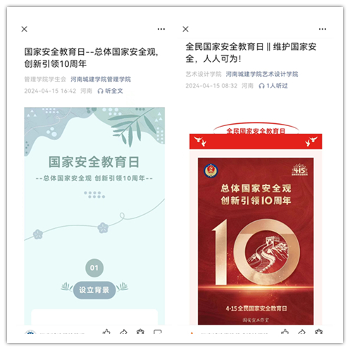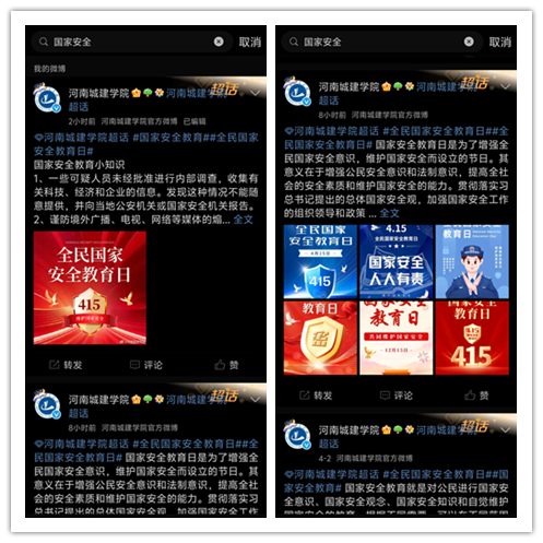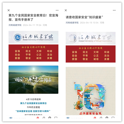 全校各单位利用校园电子显示屏滚动播放国家安全教育、保密教育等相关图文和视频资料,让全校师生在视觉上得到更为醒目的警示教育。利用学校和二级学院的微信公众号、微博,抖音、视频号等新媒体平台,推送第九个全民国家安全教育日、国家安全教育知识、保密教育知识,让广大师生随时随地都能通过手机官方微信公众号查阅相关知识,通过发动各个学院,利用二级单位的微信公众平台推送国家安全知识。依托学校的校园广播站播放有关国家安全教育宣传知识和网络公开课,向广大师生传播国家安全重要性,让学生们在课余时间对相关知识有深入的了解。