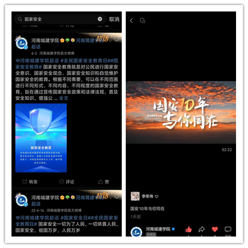 4月10日至4月19日,组织师生通过中国大学生在线网站或微信公众号参与答题,引导大学生坚定维护国家政权安全、制度安全、意识形态安全,营造国家安全人人参与、人人有责的浓厚氛围。同时,结合2024年全省大学生国家安全知识素养测试,组织师生关注“豫教思语”微信公众号,自行学习《国家安全知识学习资料》和《国家安全知识素养测试参考题库》,在4月1日-8日的五场测试中进行答题,增强广大师生的国家安全意识和法治意识,引导师生自觉践行总体国家安全观。各学院通过班会,深入学习《总体国家安全观学习纲要》和中央国安办组织编写的重点领域国家安全普及读本,深刻感受10年来国家安全工作取得的巨大成就,使关心国家安全、维护国家安全、践行总体国家安全观成为师生的思想共识和行动自觉。