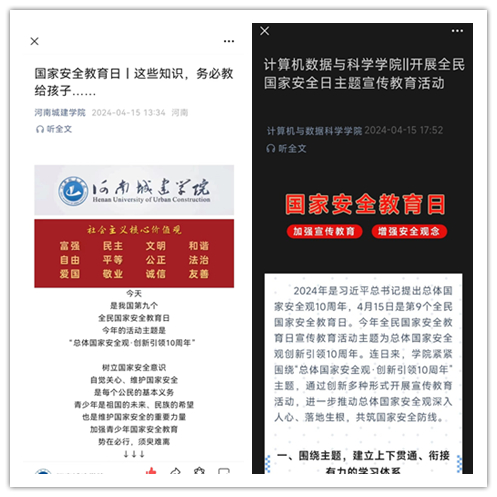4月15日,是全国第九个全民国家安全教育日,主题是“总体国家安全观 创新引领10周年”。为深入贯彻落实习近平总书记关于加强国家安全教育的重要指示批示精神,进一步增强全体师生的国家安全意识,自觉履行维护国家安全的义务,根据《中共河南省委教育工委办公室 河南省教育厅办公室转发教育部思想政治工作司关于组织开展2024年全民国家安全教育日活动的通知》要求,我校开展了2024年全民国家安全教育日系列活动。