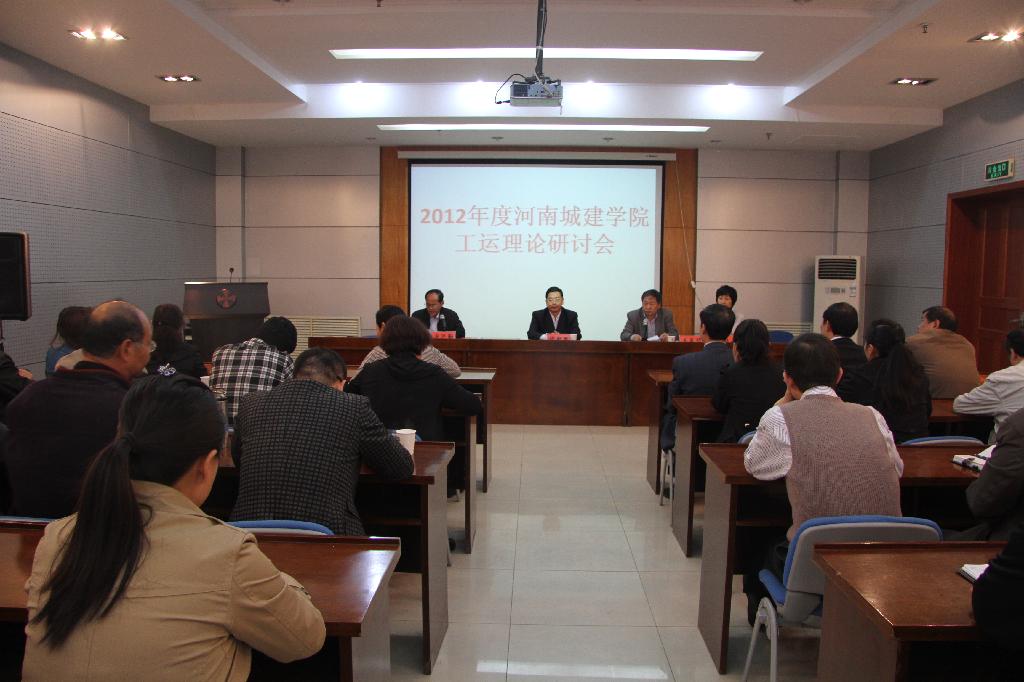 10月26日下午,我校在就业指导中心多功能厅召开2012年度河南城建学院工运理论研讨会。工会主席许朝民出席会议并讲话,各分工会主席、工运理论研究优秀成果奖获得者、受表彰的先进单位代表共50余人参加会议。