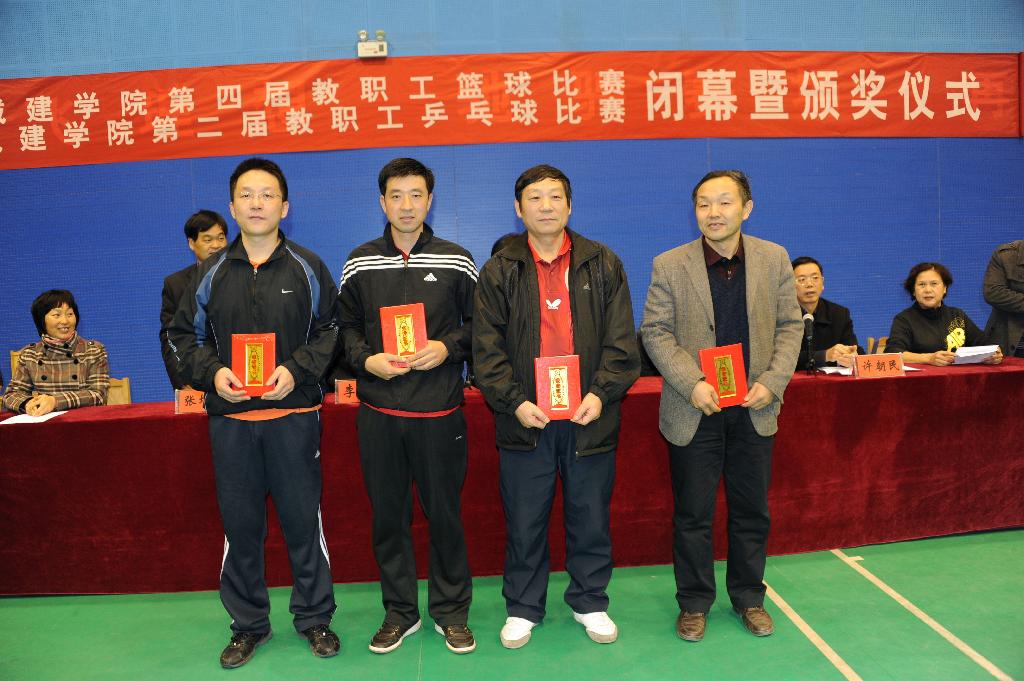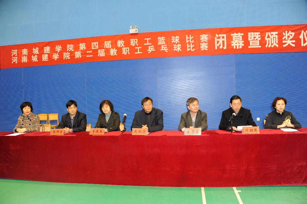 (通讯员 文枫)11月20日,由校工会主办、体育教学部承办的河南城建学院第四届教职工篮球赛、河南城建学院第二届乒乓球赛完成了预定的各项赛程,圆满落下帷幕。闭幕暨颁奖仪式在体育馆举行,校领导史战芳、王召东、李建生、张坤书、许朝民等出席闭幕式。闭幕式由工会主席许朝民主持,党委副书记史战芳致闭幕辞。