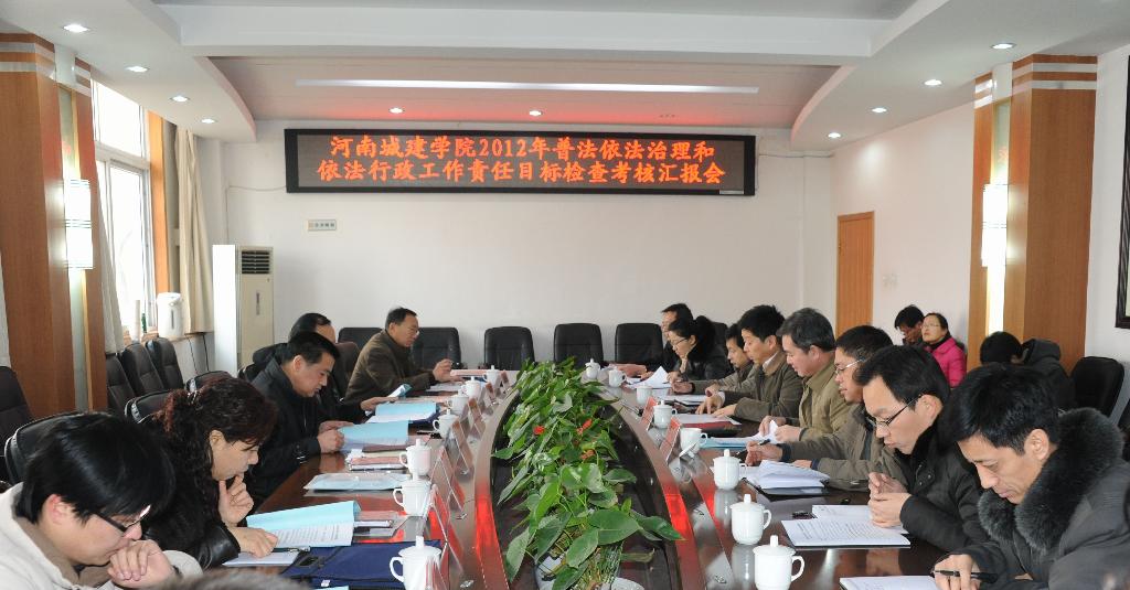 我校在第一会议室召开汇报会。学校党委副书记王召东做主题汇报,副院长赵金安主持汇报会。校依法治校工作领导小组成员参加会议。
