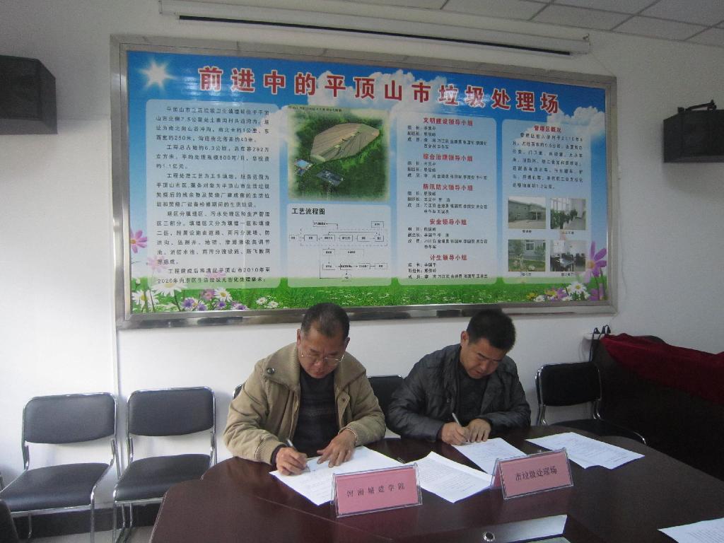(通讯员 冯兴华)3月27日下午,我校环政系与平顶山市垃圾处理场举行了共建实习基地和产学研合作签字仪式,环政系主任郭一飞、副主任田长勋、副书记焦学然、安全工程教研室主任刘章现,平顶山市城市管理处副书记、副主任陈始伟,平顶山市垃圾处理场书记辛国平、场长熊俊岭及全体员工参加仪式。仪式在垃圾处理场会议室举行。
