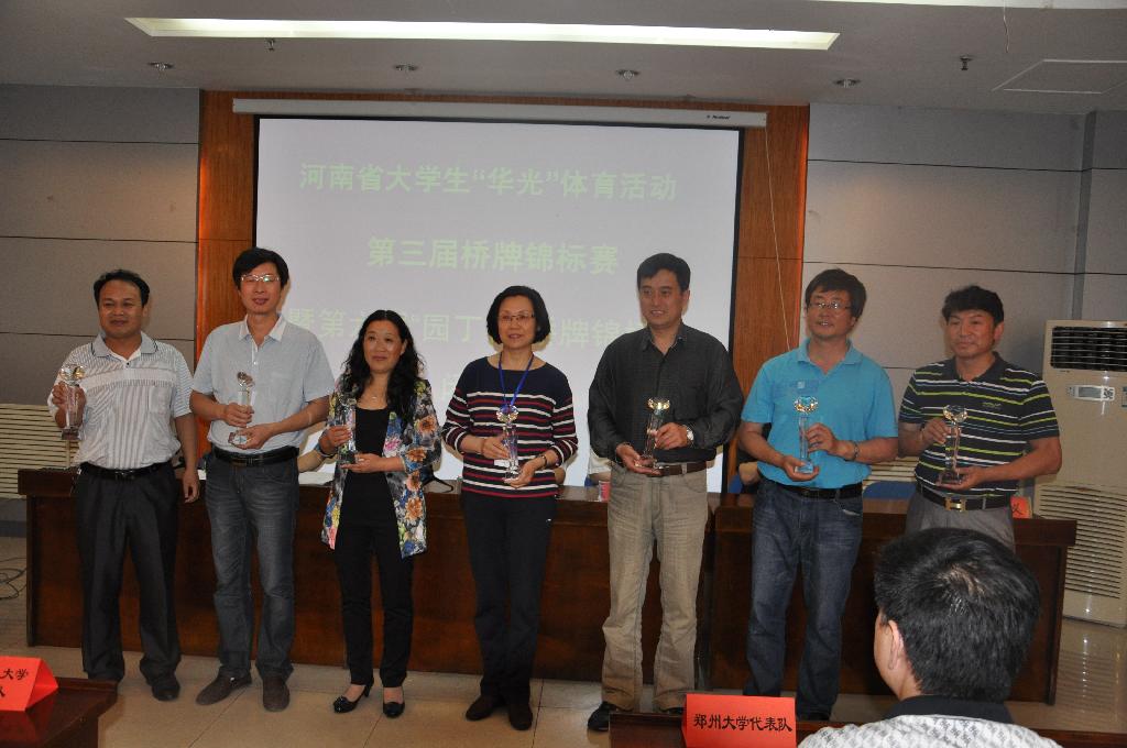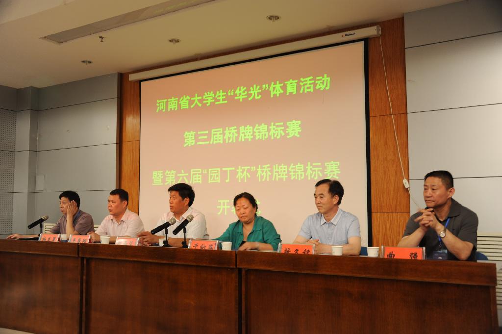 5月17日至19日,由河南省教育厅主办,我校承办的河南省“华光”体育活动第三届桥牌锦标赛暨河南省第六届“园丁杯”桥牌锦标赛在我校举行。全国大学生桥牌协会副主席、河南省学生体育总会桥牌协会主席、郑州师范学院党委书记于向英,我校副校长陈丙义、王春阳,平顶山学院工会主席张久铭,河南省大学生桥牌协会副主席、商丘市教育局副局长曲强和河南省大学生桥牌协会秘书长、本届比赛裁判长杨发星出席开幕式。开幕式由我校生科学院副院长李冰冰主持。
