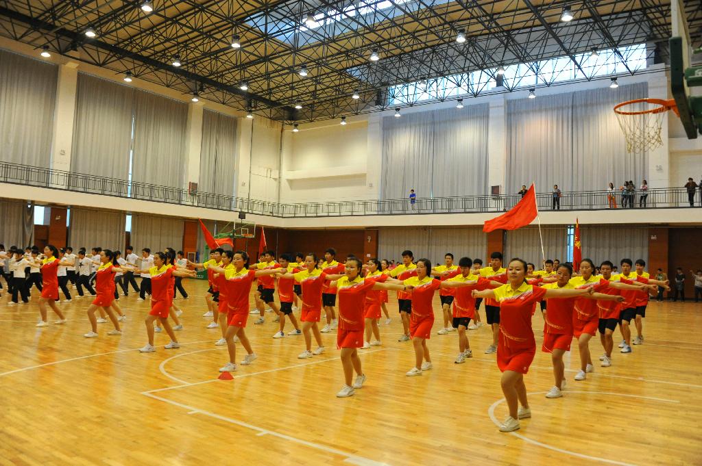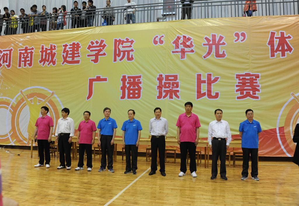 ( 通讯员 文枫 ) 4月14日下午,我校以“快乐运动,健康生活,和谐校园”为主题的第九套广播体操比赛在体育馆举行,2000余名师生参与其中。校领导李德平、孔留安、王召东、陈丙义、杨留栓、张坤书、王春阳、赵金安、许朝民观看并参加比赛。