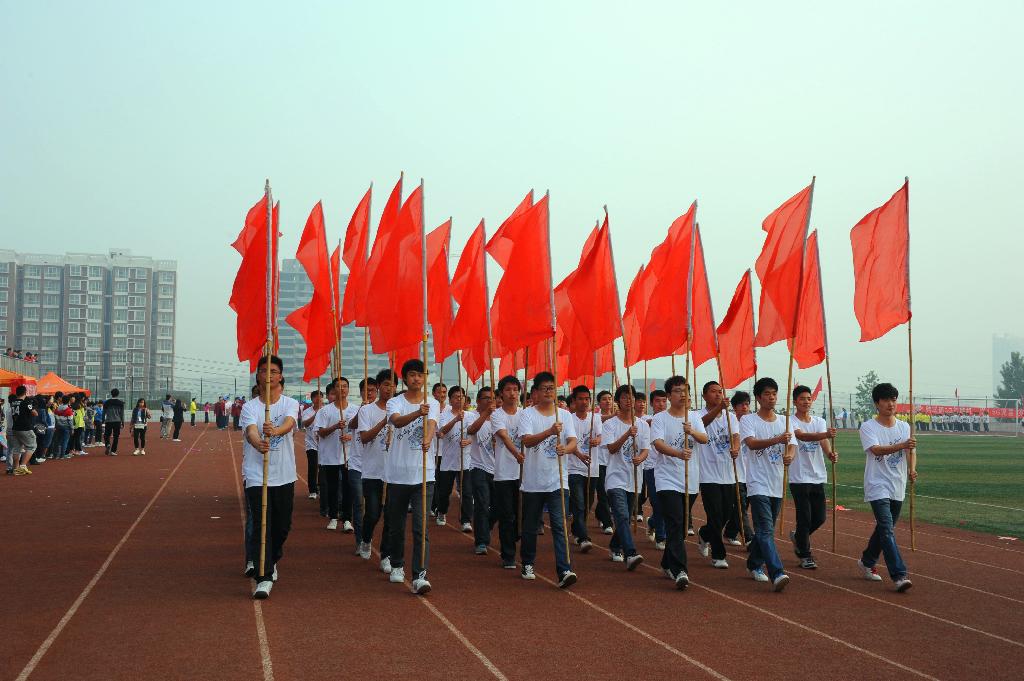 运动员、裁判员在欢快的《运动员进行曲》中依次入场。在全体师生的注目下,五星红旗伴随着雄壮的国歌声冉冉升起。
