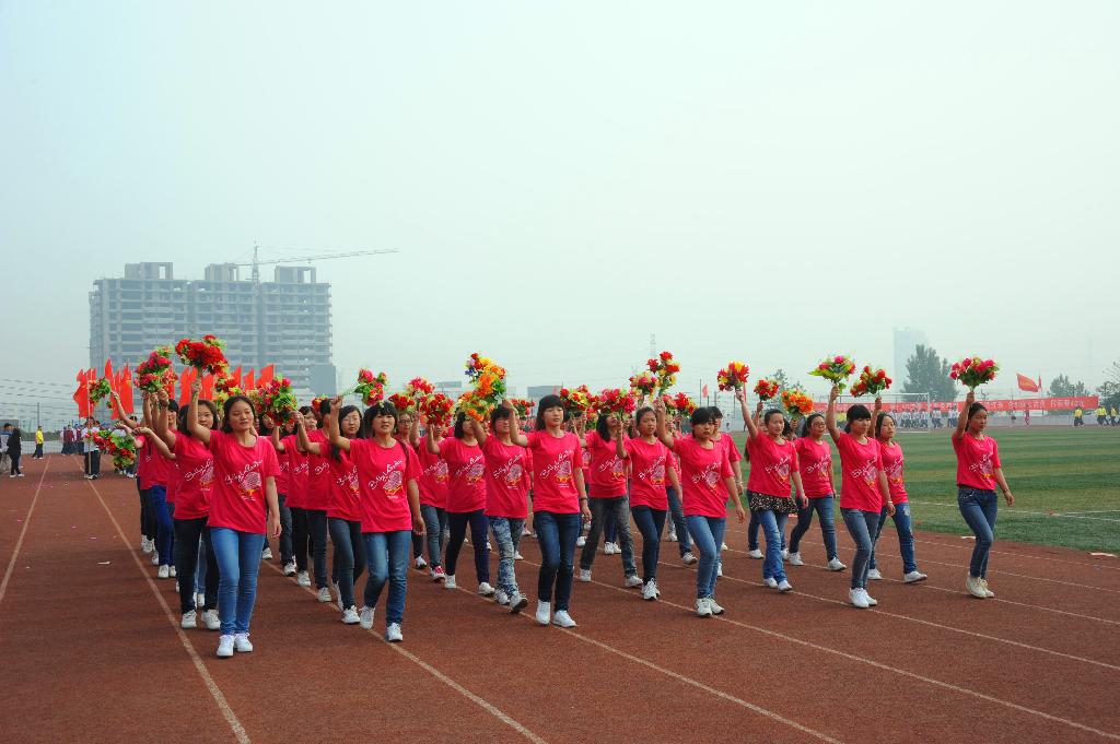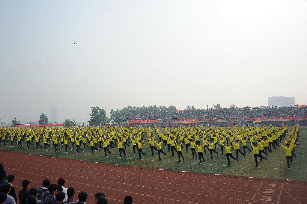 在昂扬的校歌声中,700余名教工迈着矫健的步伐走上绿茵场,进行了大型团体操表演。