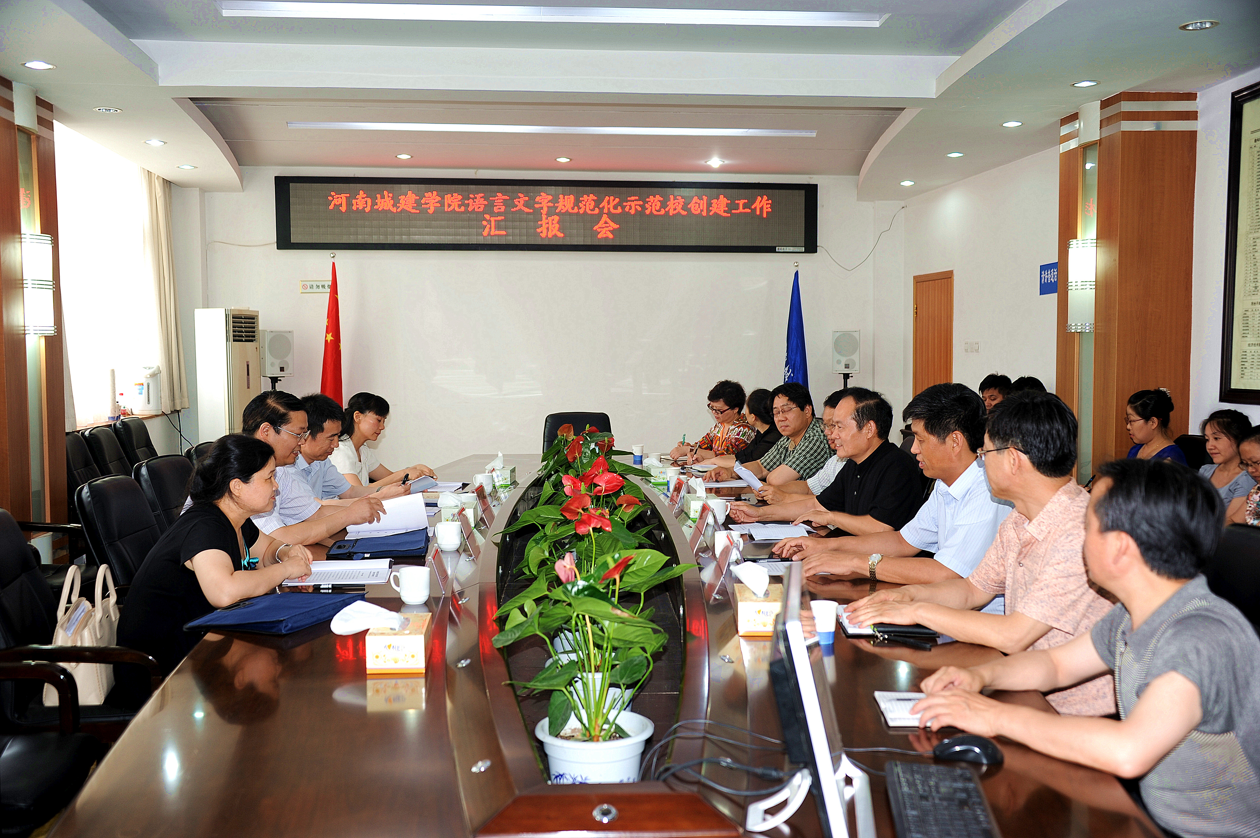 (通讯员 杨豪)6月23日,河南省“省级语言文字示范校”验收评估专家组一行四人,在省教育厅语言文字应用管理处处长闫俊山带领下,对我校创建 “省级语言文字规范化示范校”工作进行评估验收。我校在第一会议室召开汇报会,校党委书记李德平致欢迎辞,副校长杨留栓作专题汇报,副校长陈丙义主持会议。语委办、相关职能部门负责人,校国家级、省级普通话水平测试员和中文教研室全体教师参加会议。