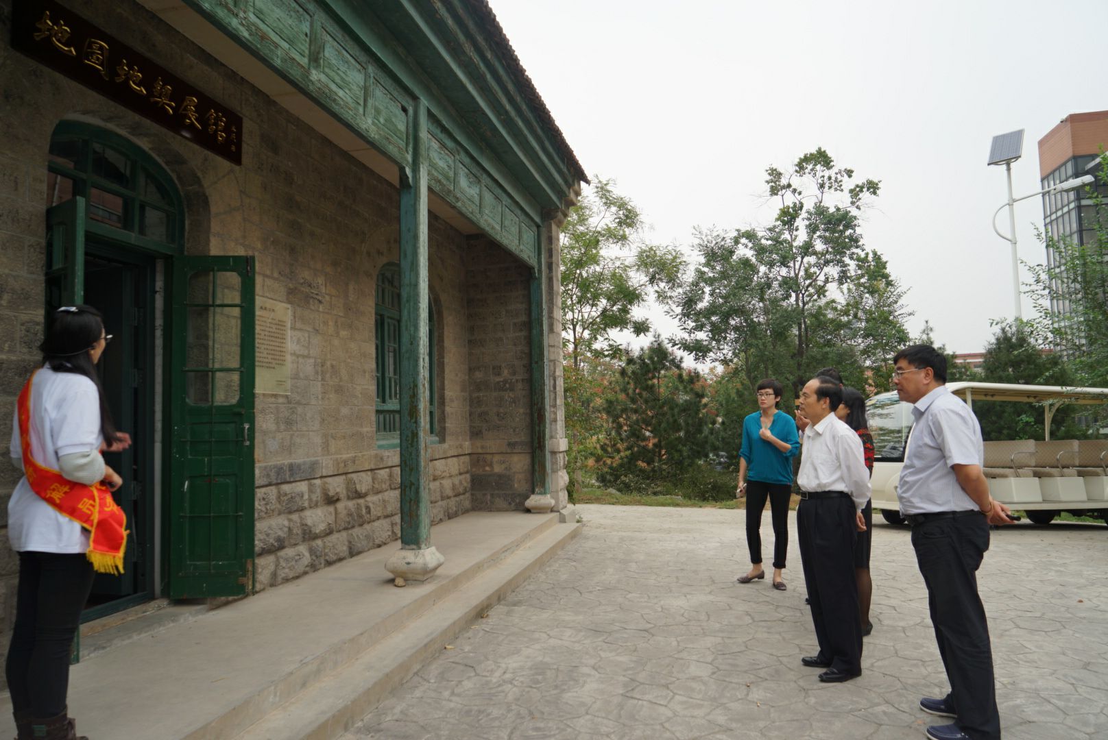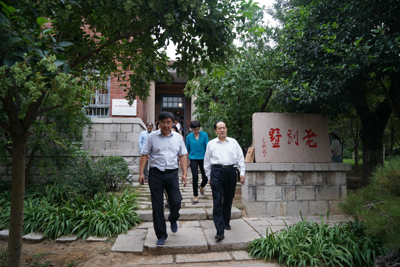 山东建筑大学党委书记王崇杰(前排左一)陪同李德平一行参观老别墅——建筑平移技术展馆