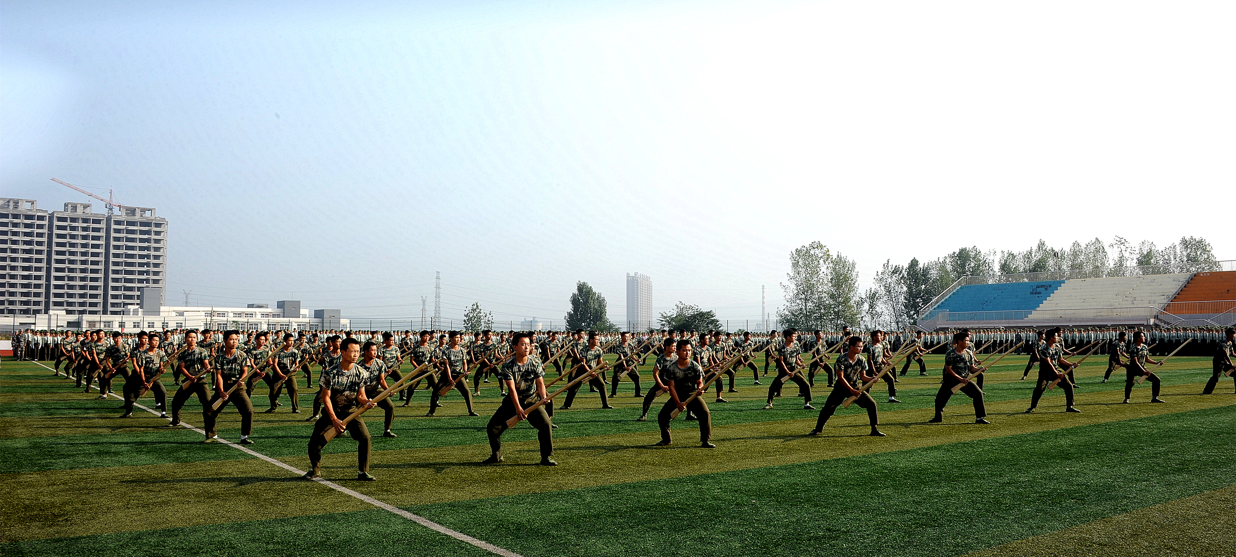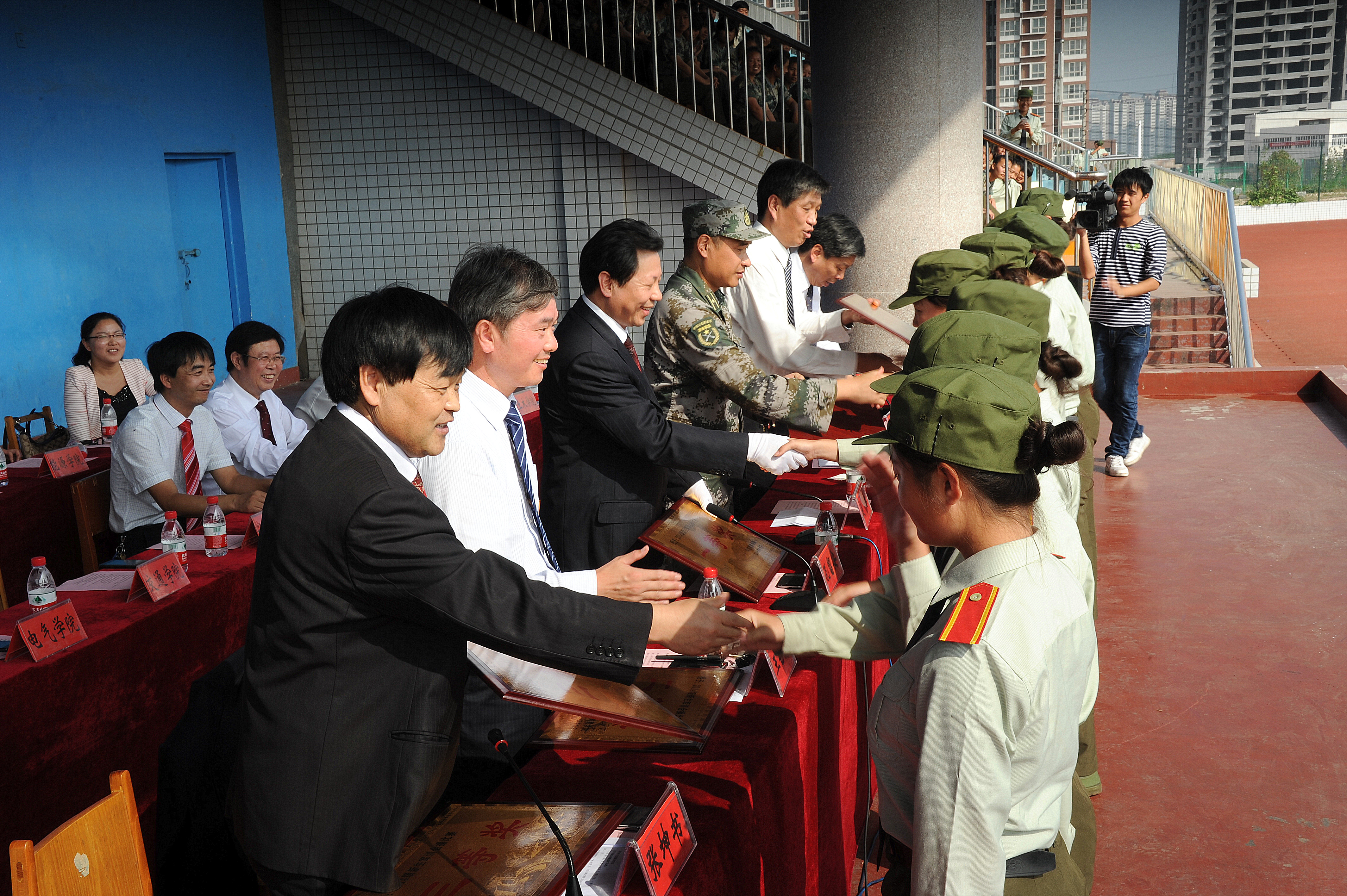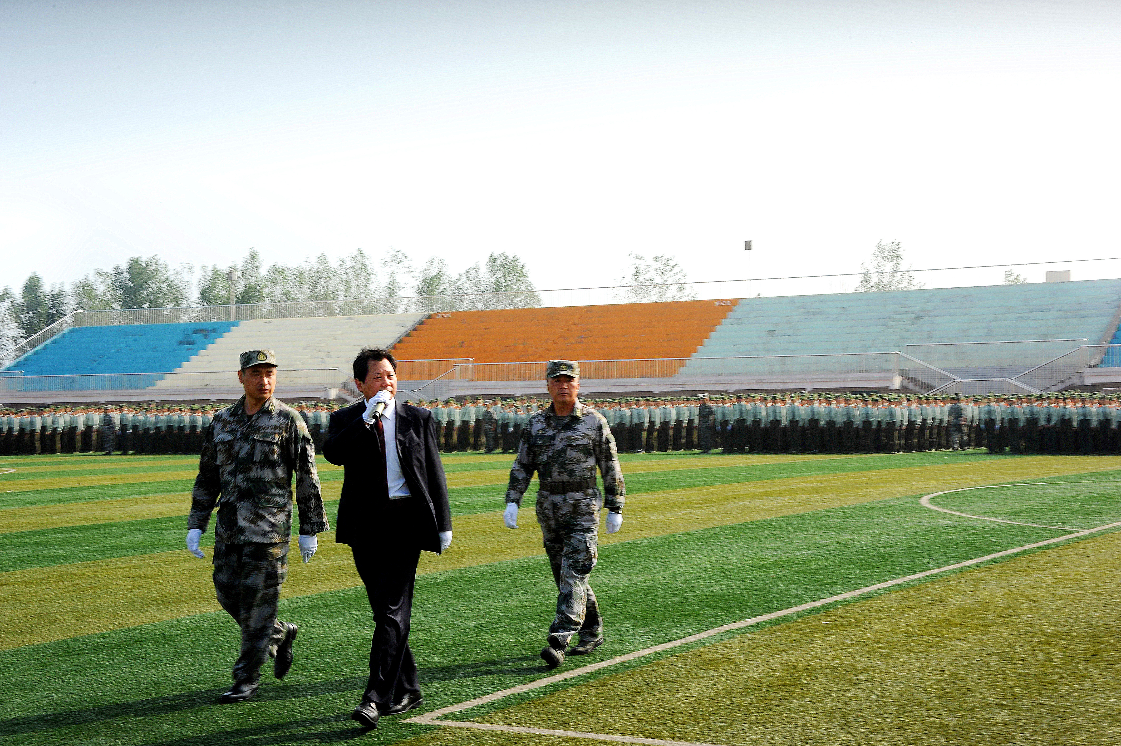 随后,校长孔留安在赵赫的陪同下,对42个参训方阵进行检阅。同学们整齐的动作、响亮的口号、挺拔的军姿展现了新生刻苦训练的成果和奋发向上、团结拼搏的精神风貌。