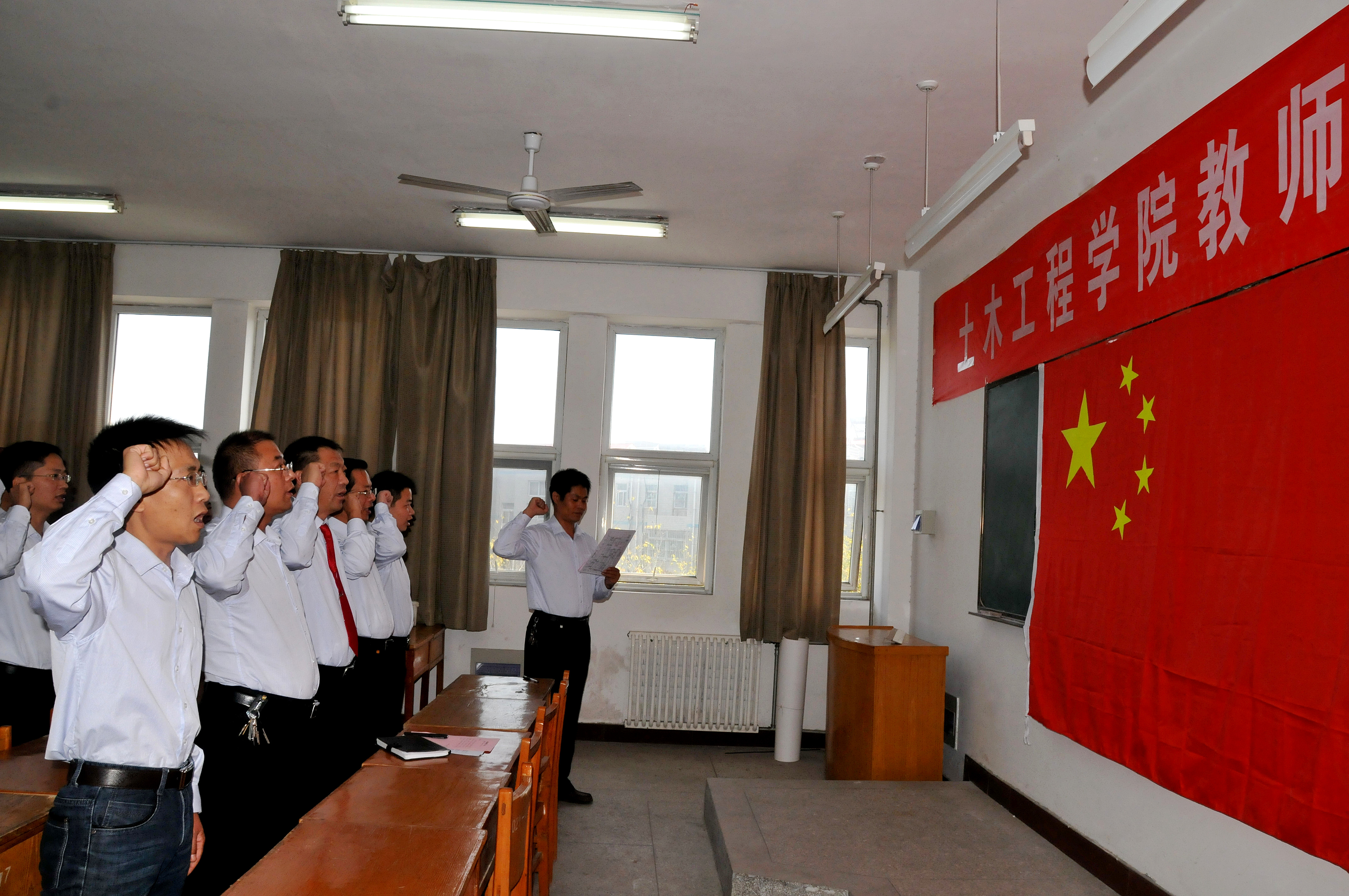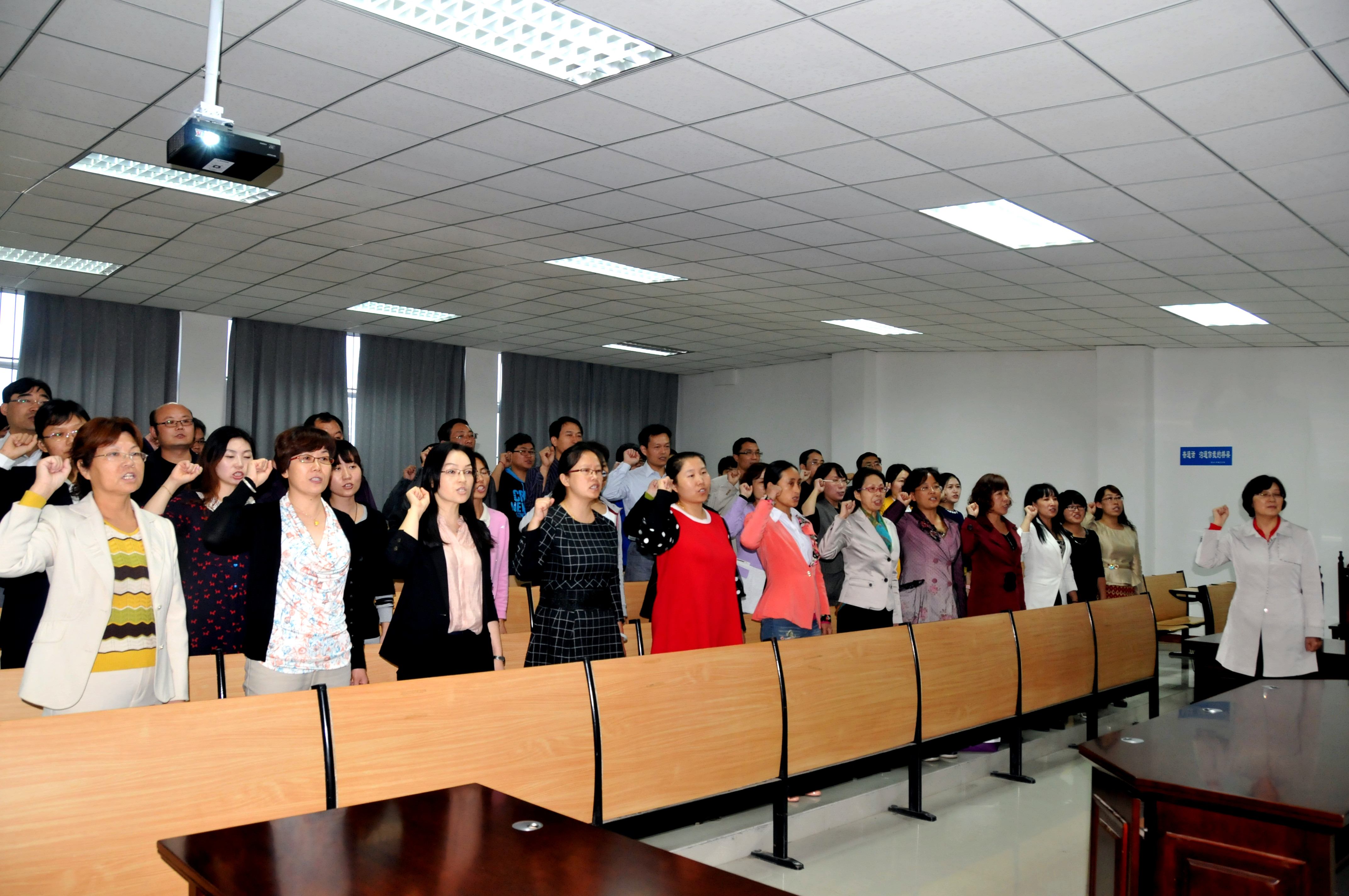 教师们面对鲜艳的五星红旗庄严宣誓:“我志愿做一名光荣的人民教师,忠诚人民教育事业,贯彻党的教育方针。爱国守法,敬业爱岗;教书育人,关爱学生;传承文明,勇于创新;严谨治学,启智求真;为人师表,乐于奉献。为实现中华民族的伟大复兴而努力奋斗!”