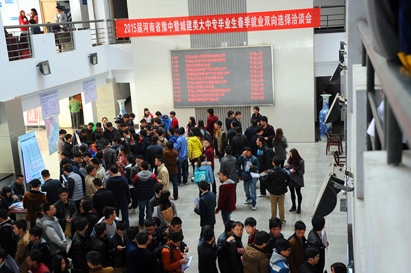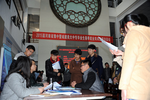 (通讯员 刘娜)3月27日,2015届河南省豫中暨城建类大中专毕业生春季就业双向选择洽谈会在我校图书馆举行。本次招聘会有河南九冶建设有限公司、中国电力建设集团河南第二火电有限公司、河南安装集团有限公司、郑州第二市政建设集团有限公司等150余家企业前来参加,提供就业岗位5000多个,招聘涵盖建筑、土木工程、道路与桥梁等专业。河南理工大学、洛阳理工学院、安阳工学院、南阳理工学院部分毕业生等共计6000余人参加招聘会。