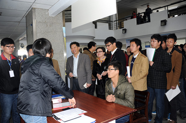 副校长赵金安现来到招聘现场,与用人单位代表和毕业生进行交流,听取用人单位对学校招聘工作的意见和建议,对毕业生在求职过程中遇到的困难、需要得到什么样的帮助等进行了解。