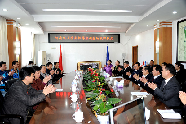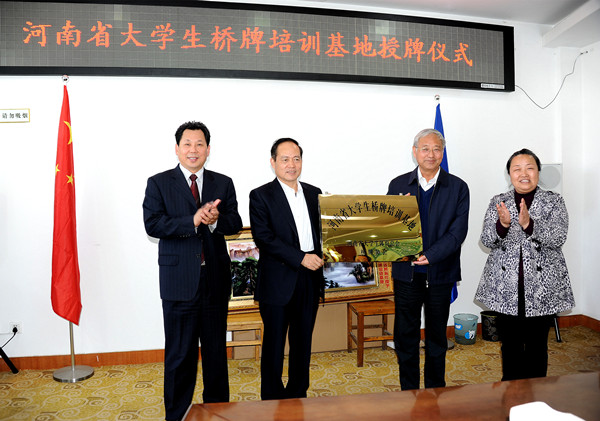 4月15日上午,我校被授予“河南省大学生桥牌培训基地”称号授牌仪式在第一会议室举行。省教育厅原正厅级巡视员张健,省学生体育总会桥牌协会主席、郑州师范学院党委书记于向英为我校授牌,校党委书记李德平、校长孔留安代表学校接牌。副校长杨留栓、王春阳,省学生体育总会桥牌协会秘书长杨发星、副秘书长邵君舟,平顶山市桥牌协会副主席、体育村党支部书记司汴晨出席授牌仪式。校学生处、团委、体育部负责同志和师生桥牌爱好者代表参加仪式。仪式由王春阳主持。