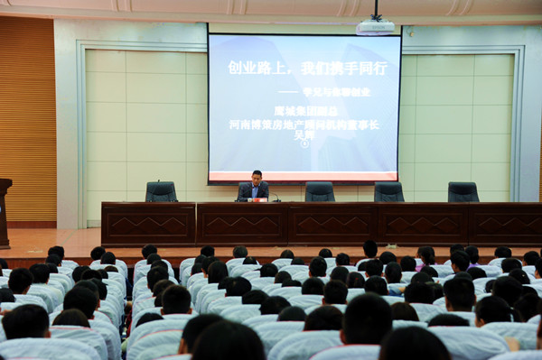 (通讯员 王居东)10月12日下午,我校第二期“创业大讲堂”在学术报告厅开讲。我校优秀校友,鹰城集团副总、河南博策房地产顾问机构董事长吴辉应邀担任首场讲座主讲。近500名师生听取讲座。