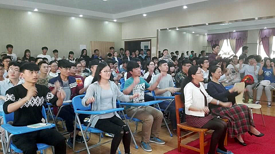 陈家海以丰富的教学经验、风趣幽默的语言向在场师生讲述了指挥的姿势,突出了“虚领顶胫,含胸拔背”的要求,并对双手的分工、眼神和面部表情、指挥图示及运动方式、起拍和收拍等进行了详细讲解和示范。他还现场带领师生一起练习指挥《中华人民共和国国歌》和《河南城建学院校歌》,耐心指导学生合唱发声方法。现场气氛活跃,掌声不断。