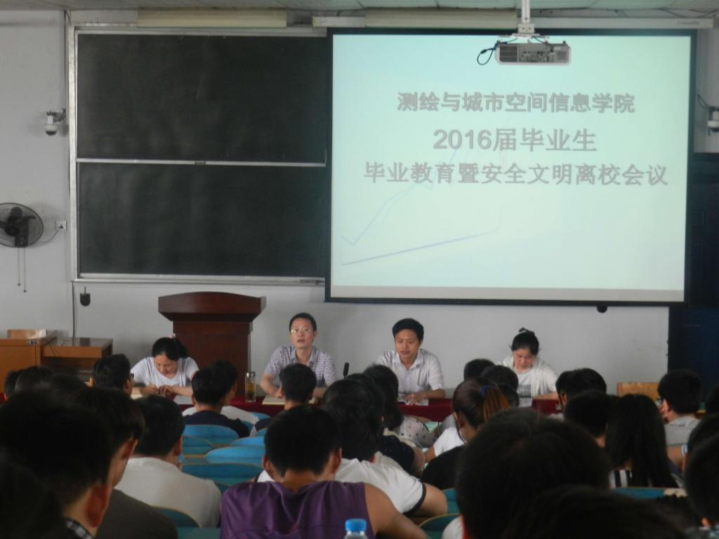 为做好毕业生文明离校工作,5月5日下午,测绘与城市空间信息学院在5号教学楼316教师召开2016届毕业生教育暨安全文明离校会议。院党总支副书记高松峰,团总支、学工办负责人,毕业班辅导员及全体毕业生参加会议。