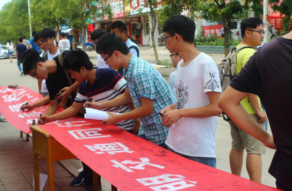 活动中,该学院学生骨干顶着烈日向过往学生宣传安全出行、文明出行的必要性,倡导文明交通行为,并号召大家签名承诺文明出行。