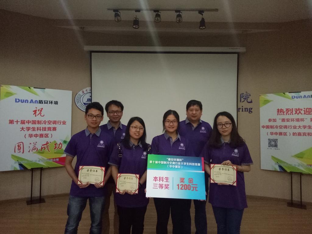 (通讯员 高莎莎 刘慧洁)6月27至28日,“盾安环境杯”第十届中国制冷空调行业大学生科技竞赛在华中科技大学举行。此次比赛是中国制冷空调行业高水平的科技竞赛,众多985、211等高校参加此次华中赛区决赛。我校能源与建筑环境工程学院由学生申珂、李晓丽、谢兆绅、池航航组成的代表队在该学院靳俊杰、周前老师的带领下,获得三等奖的好成绩,参赛作品受到专家们的一致好评。