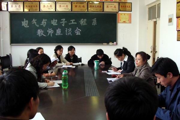 (通讯员:董燕飞)4月22日下午,电气与电子工程系在该系会议室召开了2007-2008学年第二学期期中教学检查教师座谈会,会议由副主任樊晓虹主持。座谈会上,大家畅所欲言,气氛热烈。