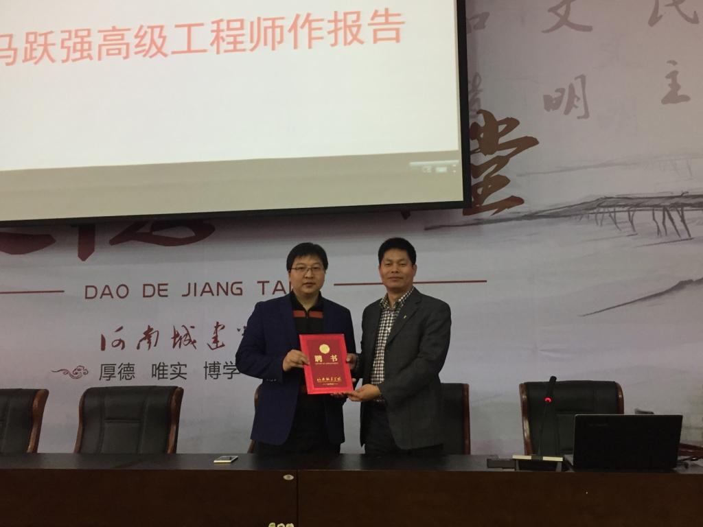 报告会前,马跃强博士受聘为我校城市地下空间工程专业客座教授,卫国祥为马跃强博士颁发聘书,希望马博士多为我校城市地下空间工程专业的转型发展出谋划策,使我校城市地下空间工程专业校企合作进展取得新突破。