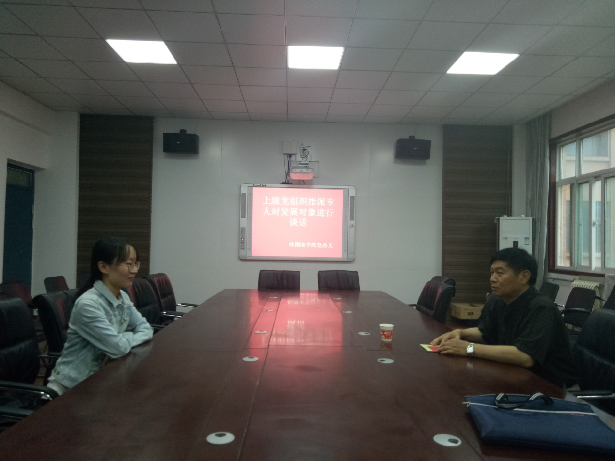 (通讯员 张枭枭)6月5日下午,外国语学院在文管校区一号教学楼306会议室对进行了预备党员的谈话。本次谈话由我校退休领导兼优秀党员任华国同志主持,学生党支部支部书记侯静雯老师以及曹婷婷等10位预备党员参加。
