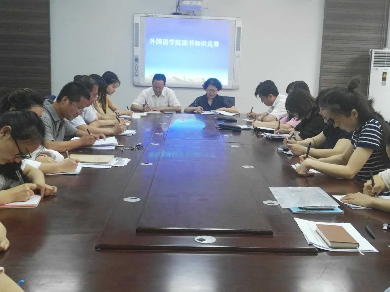 为了培养全体教师员工好读书,读好书的良好习惯。6月12日在学院会议室举行了“书香伴我同行”为主题的知识竞赛活动,竞赛活动由外国语学院党总支书记袁晓主持,全体教职员工积极踊跃参加。竞赛采取选择题的形式,整个竞赛活动在紧张,有序地进行,取得圆满成功,达到了预期目的。经过激烈角逐,最后评出一等奖一名,二等奖二名,三等奖三名。