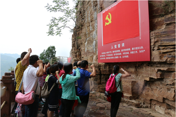 党员重走红旗渠,参观红旗渠纪念馆,驻足青年洞、分水闸,身临其境感受到了老一辈革命群众付出的巨大心血与劳动,感悟到了老一辈革命群众铁一般的信念和山一般的意志。在红旗渠青年洞前,党员们面对党旗,郑重宣誓,重温了入党誓词。