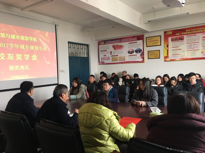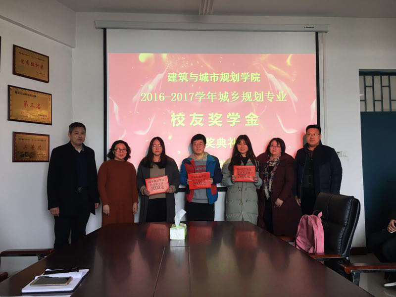 (通讯员 许京生)1月16日,建筑与城市规划学院在四号教学楼A511举行了2016─2017学年城乡规划专业校友奖学金颁奖典礼。院长邢燕、党总支书记王森、副书记周勃、副院长朱晓菲以及全院教师参加了本次颁奖典礼。