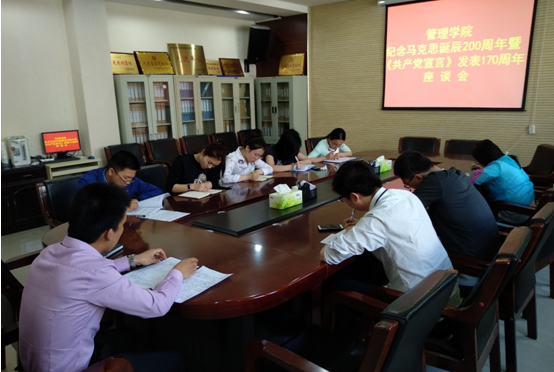 (通讯员 姜孟达)5月3日上午,管理学院在三楼会议室召开纪念马克思诞辰200周年暨《共产党宣言》发表170周年座谈会,学院党总支副书记马斌主持会议,党支部书记参加会议。