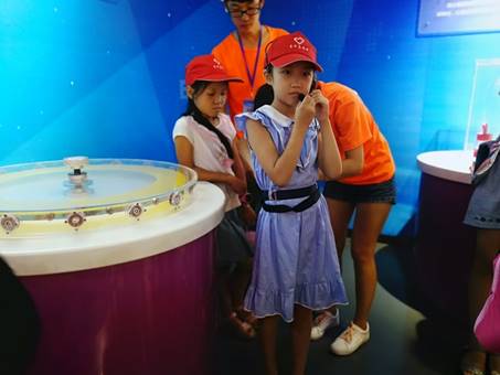 到达宝丰科技馆之后,先由志愿者带领小朋友再熟悉一遍昨天的培训内容,为十点半将要举行的培训成果展示做准备。在熟悉过程中,小朋友听得比昨天更加认真仔细,在进行展示之前,所有小朋友都可以自信并且大声的讲解科技产品。在培训成果展示的过程中,小朋友戴上扩音器,化身科技馆小讲解员。他们自信并且大声地讲解着科技产品,在一旁观看的父母们以及大学生志愿者们都为他们感到骄傲。小朋友们的学习和语言讲解能力远远超出了志愿者们的预估。仅仅通过昨天一上午的培训,小朋友们就可以为别人讲解自己原本不曾接触过的科学知识。小朋友的培训成果展示完毕后,由徐娟老师为小朋友们颁发“优秀志愿者”的证书以及纪念品书签。